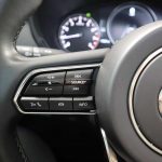 The upscale cabin indulges with heated front bucket seats, power driver and passenger adjustments, leather-wrapped steering wheel and shift knob with mounted audio controls, tri-zone automatic climate control including rear air, heads-up display, Mazda Connected Services with voice command, infotainment supporting AppLink/Apple CarPlay/Android Auto, Pandora integration, and an 8-speaker AM/FM sound system.